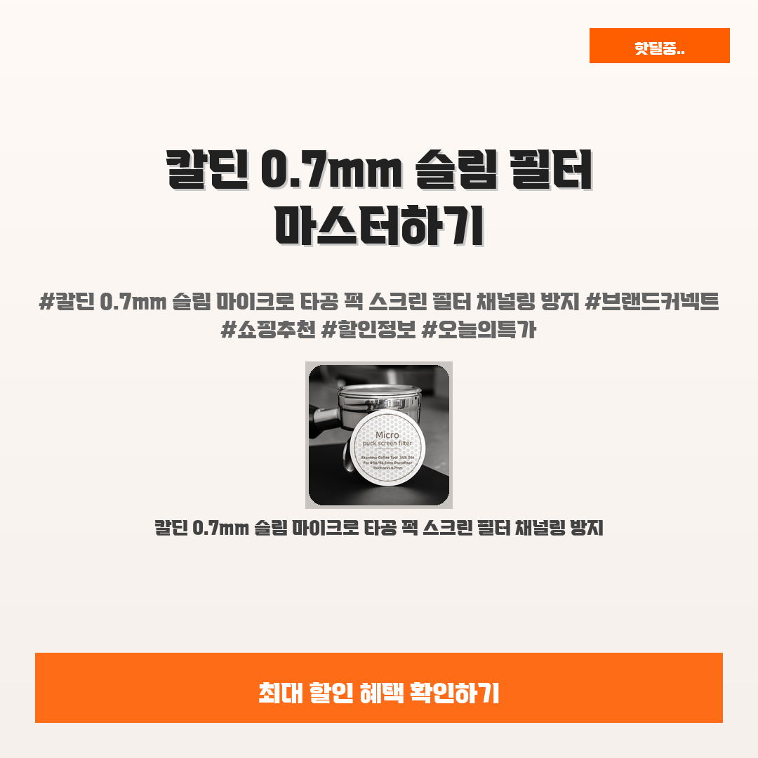 🛍️ 이 포스팅은 네이버 쇼핑 커넥트 활동의 일환으로,판매 발생 시 수수료를 제공받습니다.오늘 소개할 제품은 단언컨데,,그야말로 칼딘 0.7mm 슬림 마이크로 타공 퍽 스크린 필터 채널링 방지의 완벽한 선택입니다!혹시 여러분도 채널링 문제 때문에 커피의 맛이 아쉬웠던 적이 있으셨나요? 저도 그런 경험이 많았어요. 그래서 이 문제를 해결해 줄 칼딘 0.7mm 슬림 마이크로 타공 퍽 스크린 필터를 만나게 되었답니다.이 필터는 드디어 저의 커피 문제를 해결해 주었어요! 이제는 맛있는 커피를 즐길 수 있게 되었답니다 여러분도 만족스러운 커피 타임을 원하신다면 이 필터를 꼭 사용해 보시길 추천드려요.가성비도 뛰어나서, 15,300원에서 22% 할인된 11,800원에 구매할 수 있어요! 판매량과 후기가 이를 증명..